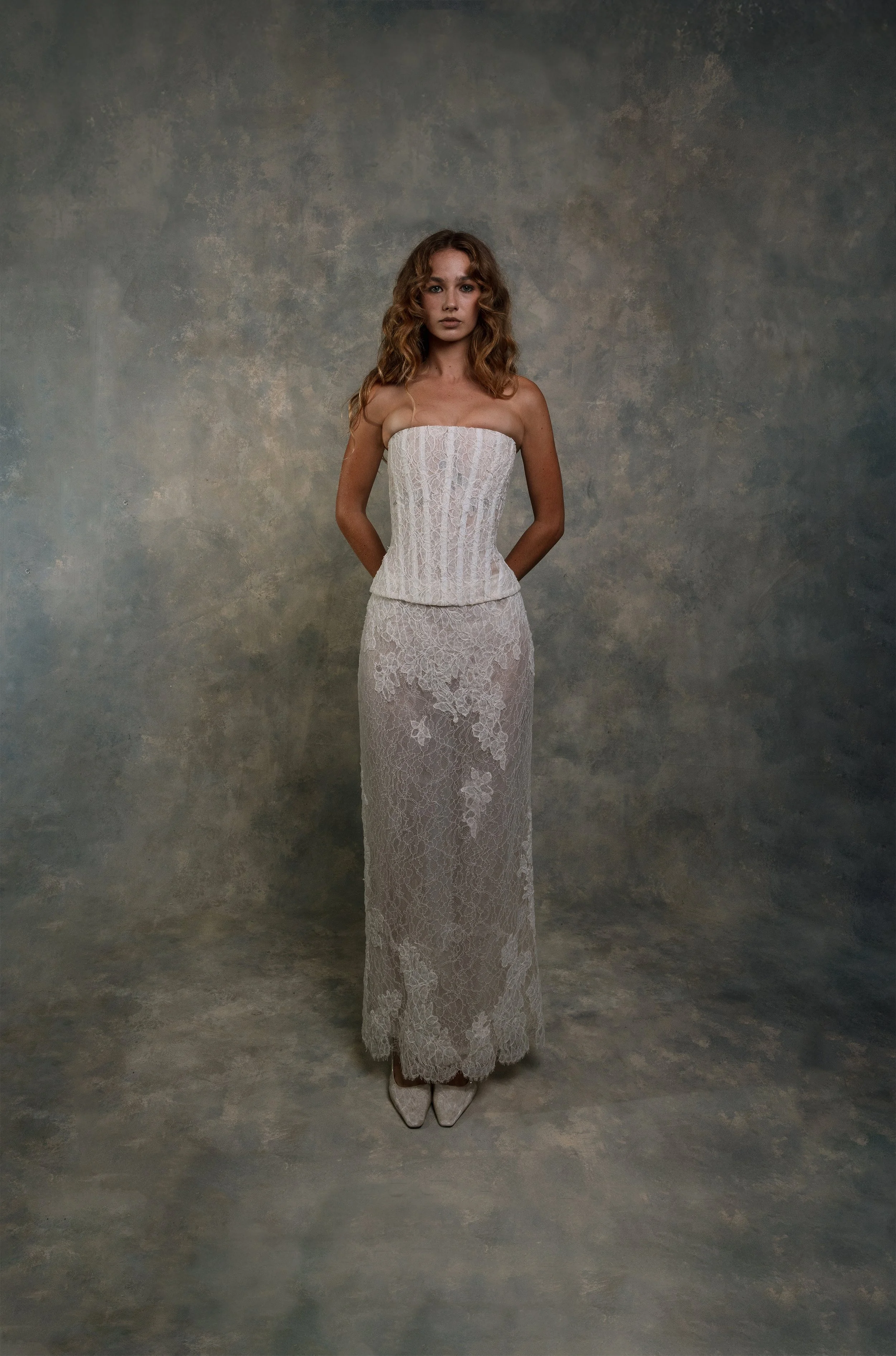 We incorporated intricate, hand-sewn demi-couture techniques to evoke “eroding lace,” chose antique-inspired ivory and creamy off-white silks, and draped organic silk tulle and taffeta with hand-tucked pleats.